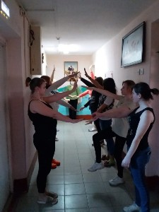 Очень увлекательная подвижная игра. В конкурсе с удовольствием приняли участие обучающиеся первого и второго курса. Две команды из 4х человек соревновались на время, кто быстрей сделает мускульного парня. Победила команда первого курса. Победители получили сладкие призы.
