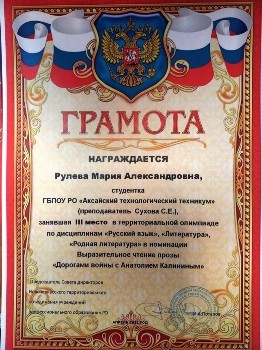 Обучающиеся Аксайского технологического техникума приняли участие в территориальной олимпиаде по дисциплинам «Русский язык», «Литература», «Родная литература». Трушкина Виктория (преподаватель Шевцова Н.Г.) награждена грамотой за II место, Рулёва Мария (преподаватель Сухова С. Е.) награждена грамотой за III место, Задонская Ангелина (преподаватель Шевцова Н.Г.) и Власенко Татьяна (преподаватель Сухова С.Е.) получили Сертификаты.