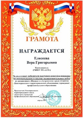 Обучающиеся Аксайского технологического техникума Харланов Захар и Урмашкин Савелий приняли участие в выставке – конкурсе поисково - исследовательских и опытно-экспериментальных работ по дисциплинам «Физика» и «Астрономия», под руководством преподавателя Тюкиной Елены Владимировны. Урмашкин Савелий получил грамоту за I место в номинации: «Поисково – исследовательская работа», Харланов Захар за I место в номинации: «Реферат», преподаватель Елена Владимировна Тюкина получила сертификат за подготовку победителя.