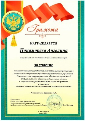 Обучающаяся Аксайского технологического техникума Власенко Татьяна (преподаватель Тимофеева В.И.) участвовавшая в территориальной олимпиаде по информатике и информационным технологиям в номинации: «Пользователи ПК (непрофессионалы)» награждена грамотой за II место, а преподаватель Тимофеева Виктория Ивановна грамотой за подготовку призёра.